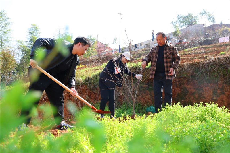 此次活动坚持“生态优先、因地制宜”原则,精选适生树种,共栽植桃树1600余株,涵盖青金湘玉黄桃、油蟠桃、极早熟黄桃、脆香蜜桃等数5种经济桃树品种及春早一号、南国春晓、丹凤朝阳、绿叶垂枝、洒金8种观赏类花桃树。在布局设计上,注重功能融合,沿游步道集中种植观赏类桃树,打造春花烂漫的景观林带。在平地阳光充足区域则栽植经济桃树,兼顾生态效益与经济效益,既美化山体环境,又为今后花果山增添一片“致富林”。