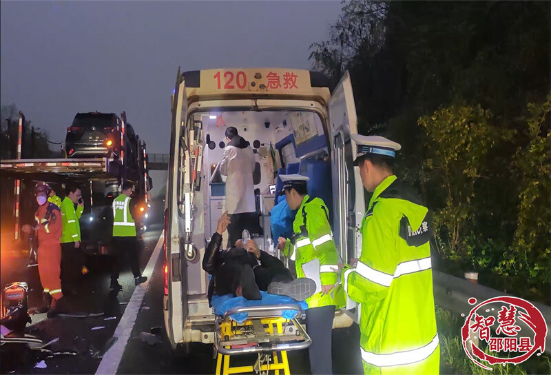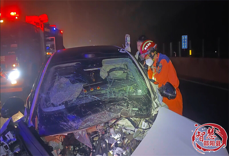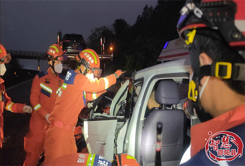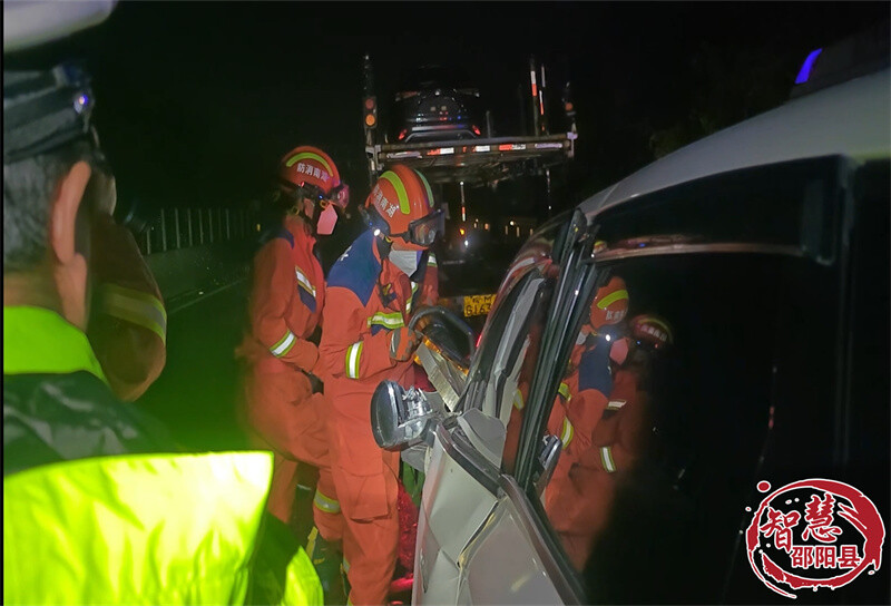 4月7日5时36分许,二广高速邵阳往广州方向路段发生一辆私家车追尾货车事故,因私家车驾驶室严重变形,司机被困车内,邵阳县消防部门立即出动前往救援。