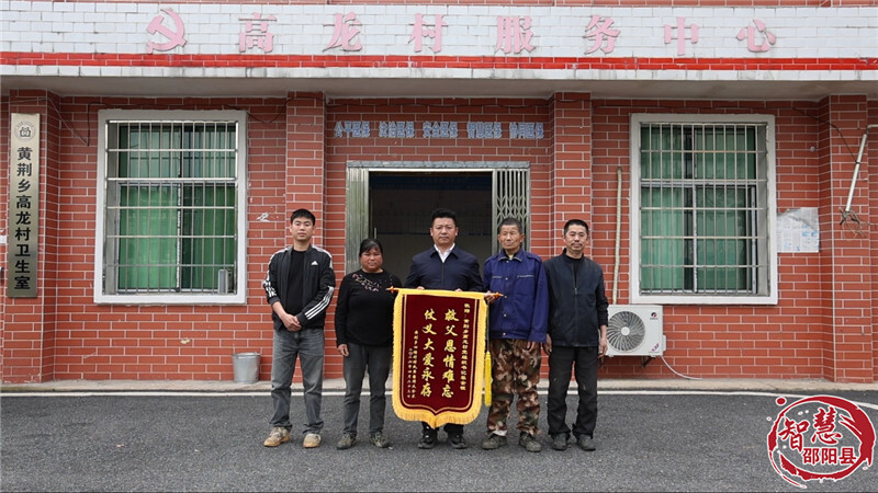 4月24日,我县黄荆乡四塘村村民黄意得,来到相邻的高龙村村部,将一面锦旗送到高龙村党支部书记黎金银及两位热心村民手中,对他们此前在暴雨中,及时救助自己摔倒受伤的95岁老父亲黄明有,表达最诚挚的谢意。
