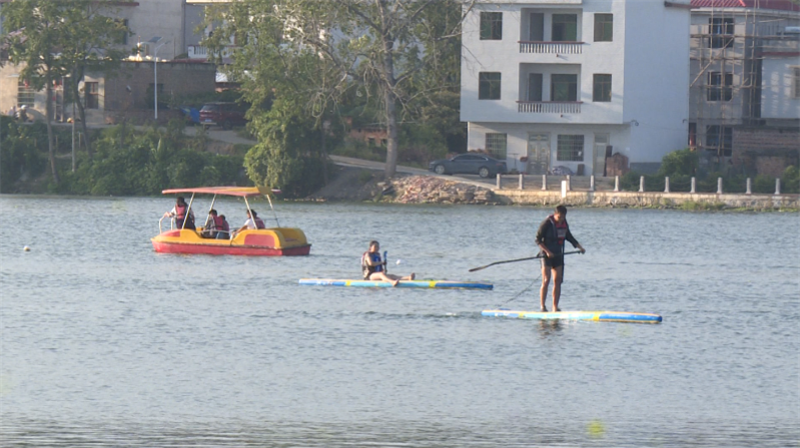 天子湖湖面波光粼粼,游客划着桨板在湖面上缓缓前行;露营区各色帐篷错落有致,孩子们在草坪上放风筝、做手工,家长们围坐聊天,不时举起手机记录美景。