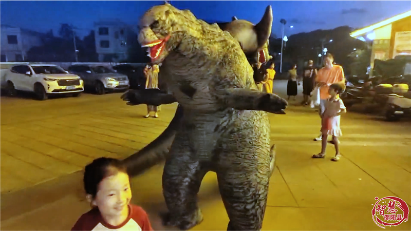 夜幕降临,弄子口景区开始进入热闹模式。主干道上,“奥特曼Vs巨型怪兽”主题巡游拉开晚间活动序幕。巨型怪兽与奥特曼人偶穿梭于人群之中,不时驻足与游客互动合影。熟悉的动漫形象唤起不少游客的童年记忆,现场欢呼声与快门声此起彼伏。