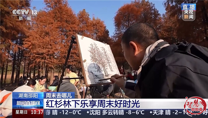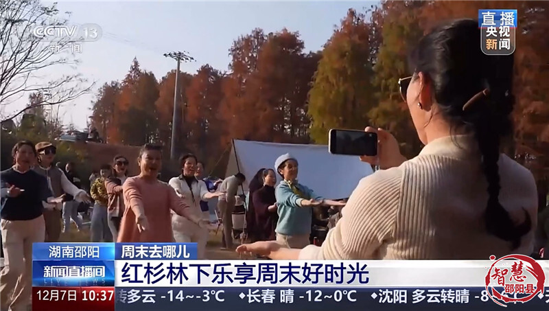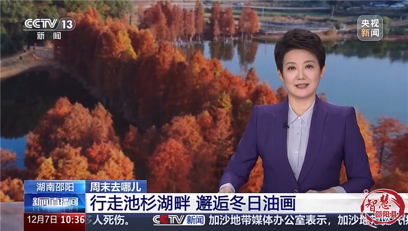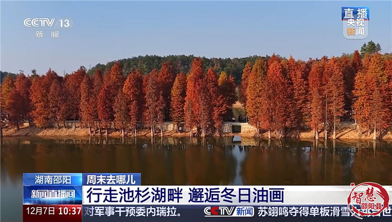 12月7日,中央广播电视台《周末去哪儿》栏目直播连线,用4分钟的直播时间带领全国各地观众走进了如诗如画的邵阳县长阳铺镇泉井水库池杉林。